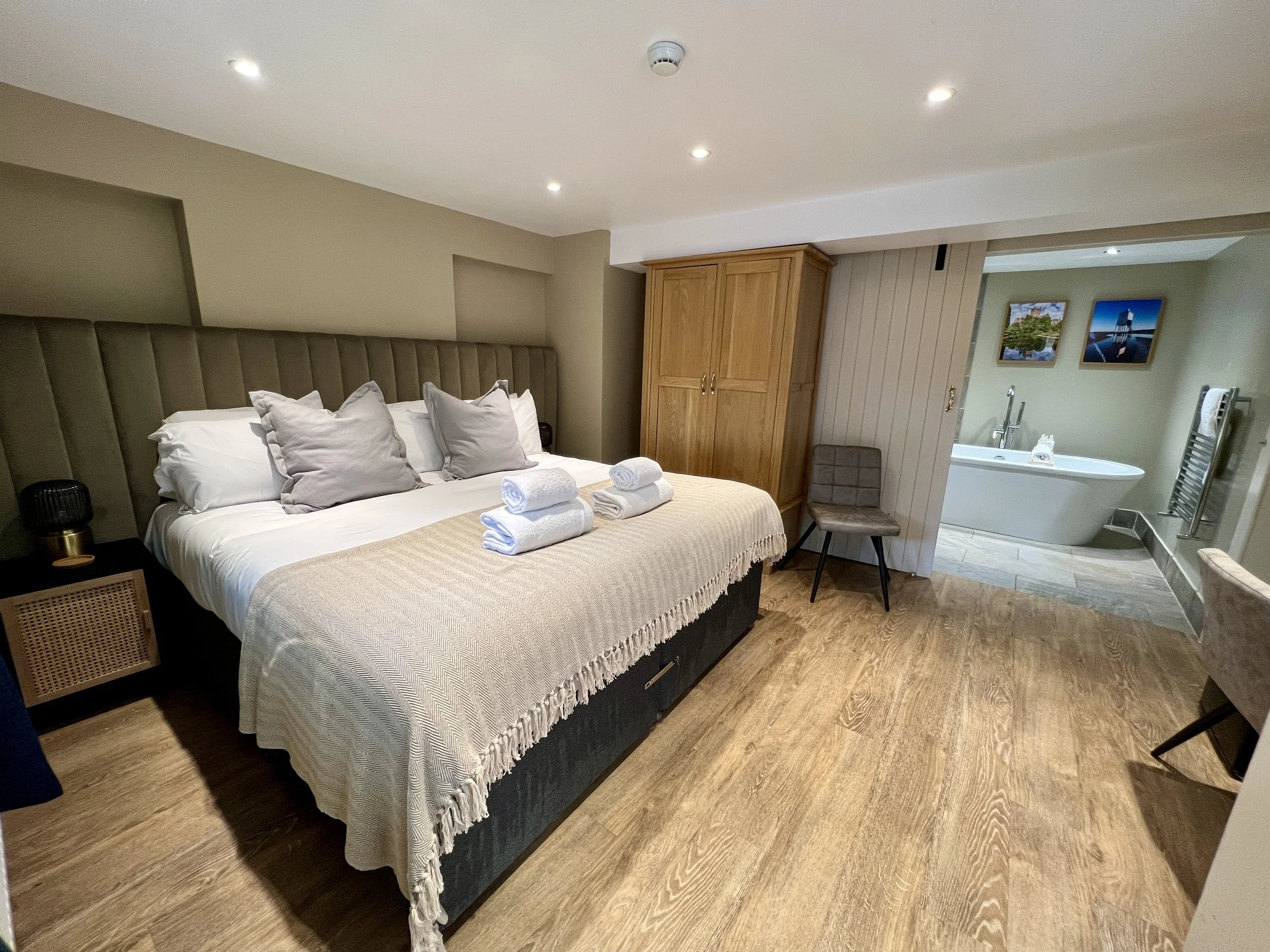 Our Premium Pub rooms are located on the first floor above our Pub, one of which features a free standing bath in the bedroom. These rooms have superking size beds and ensuite bathrooms.